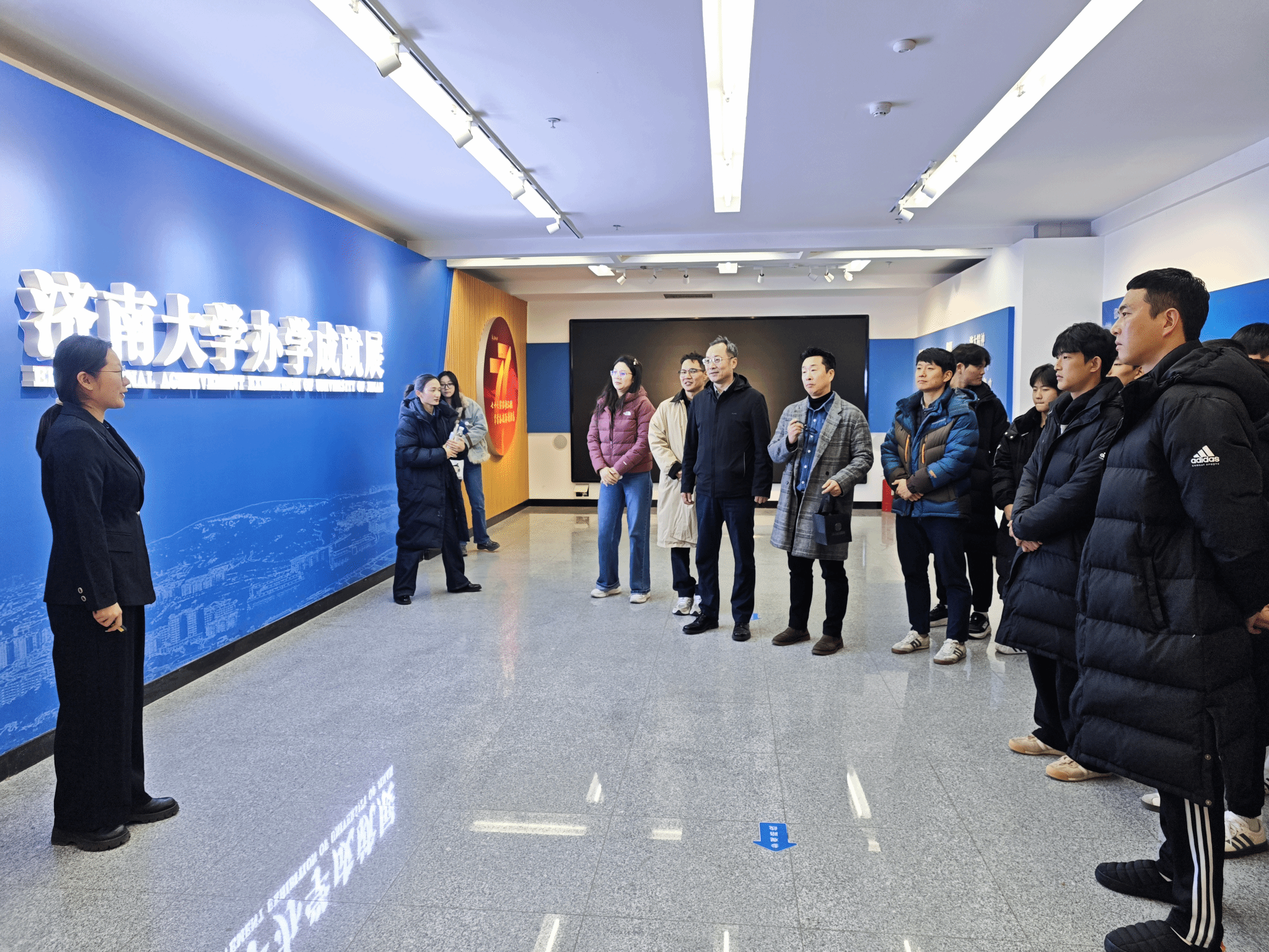 活动伊始,驻华韩国文化院郑钟元、韩国飞翔跆拳道队团长全寅律、总教练沈贞浩等一行,在院长亓圣华陪同下,走进太阳成集团tyc41183办学成就展。从办学历史的时光长廊到学科建设的成果展板,从人才培养到科研创新,来宾们在讲解中全方位了解学校发展脉络,尤其对学校在专业建设、文化活动、产学研融合等方面的成果给予高度评价,为后续专业交流奠定认知基础。
