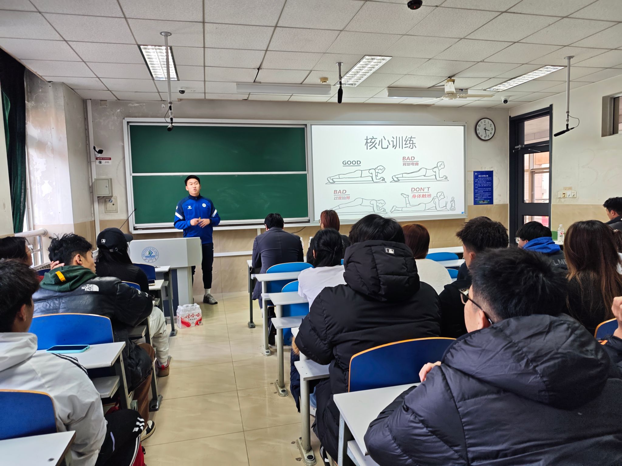 第二环节由专业教练团队主讲青少年体能训练师职业实操。教练团队聚焦岗位核心能力,先围绕“青少年体能训练的核心原则”“不同年龄段训练方案设计要点”“体能评估与安全防护规范”展开理论讲解,结合国内青少年体育培训市场现状,分析该岗位的就业前景、薪资水平与机构合作模式;随后邀请在场学生上台参与互动演练,以“青少年基础体能训练动作示范”“简易体能评估流程操作”为主题,让学生亲身实践训练指导、动作矫正、评估记录等实操环节,教练团队针对演练中的问题实时点评指导,帮助学生直观掌握岗位实操技能,明确职业能力提升方向。