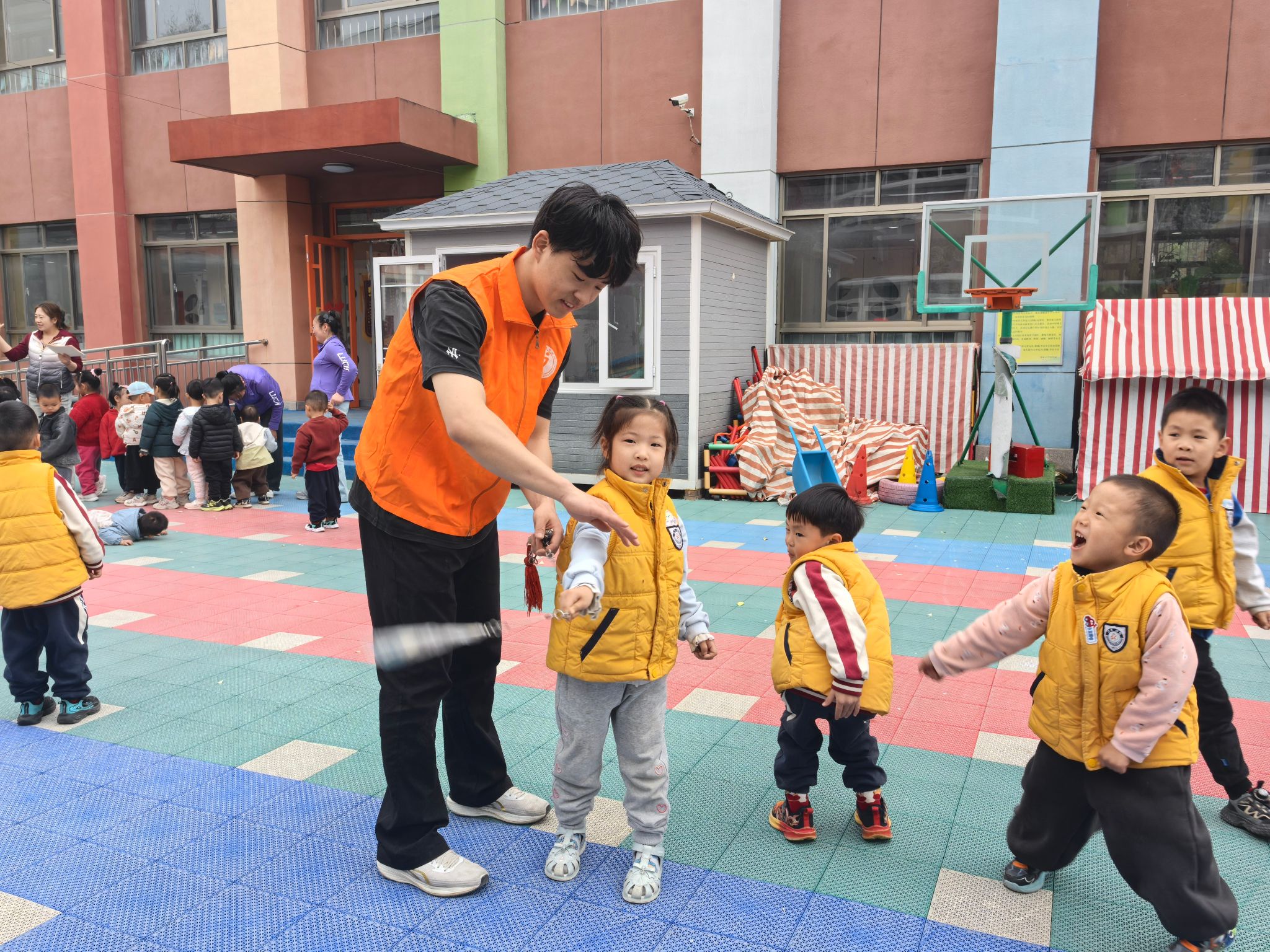 “小手臂举高,轻轻挥棍,像这样慢慢摆动~”志愿者们耐心示范、手把手纠正,孩子们跟着节奏认真模仿,现场笑声不断。不少小朋友在志愿者鼓励下,主动上前展示学习成果,眼神里满是自信与喜悦。幼儿园老师表示,此次活动让孩子们在家门口接触到专业传统武术内容,既丰富了课后生活,也播下了传统文化的种子。