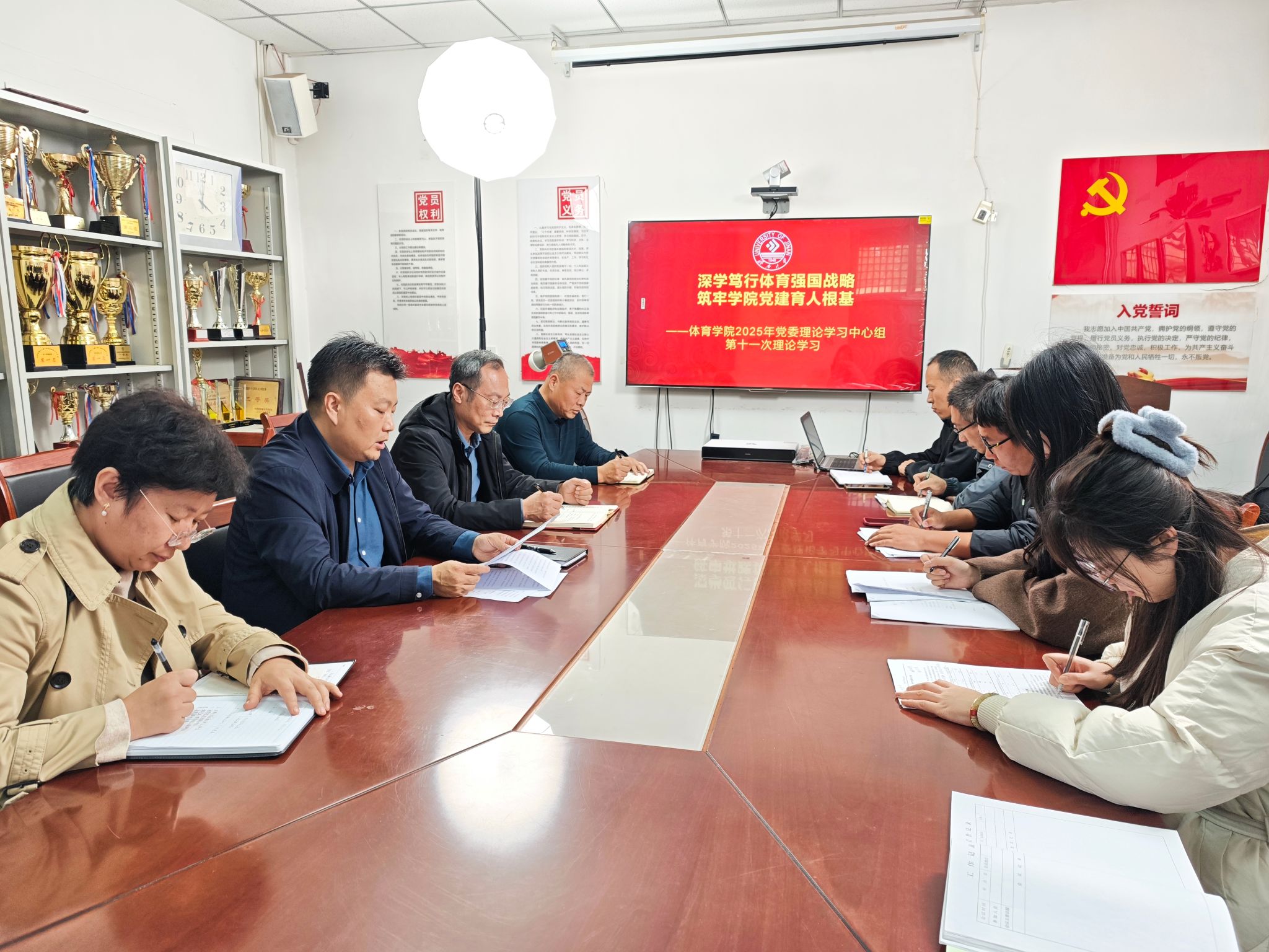 2025年11月4日下午,tyc41183太阳成集团党委理论学习中心组开展了以“深学笃行体育强国战略,筑牢学院党建育人根基”为主题的2025年第十一次学习活动,党委理论学习中心组成员、全体学生工作人员参加此次学习。